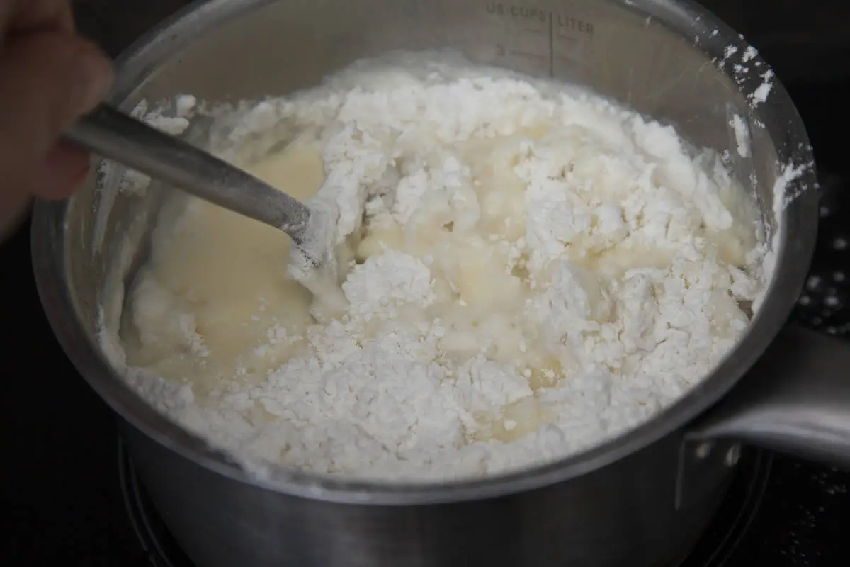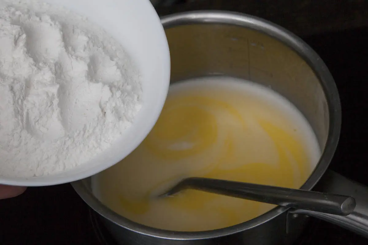 Для заварного теста вскипятите молоко с водой, солью и сливочным маслом.