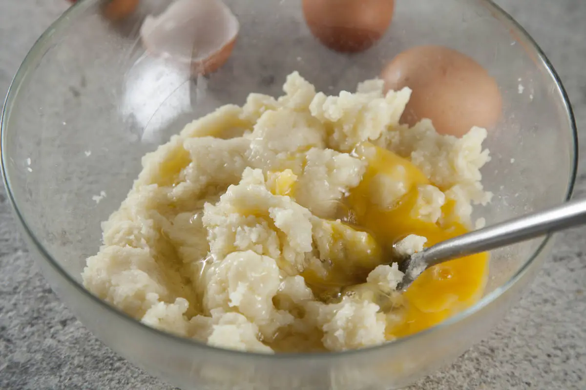 Добавляйте яйца по очереди, каждый раз тщательно размешивая тесто ложкой до однородной массы.