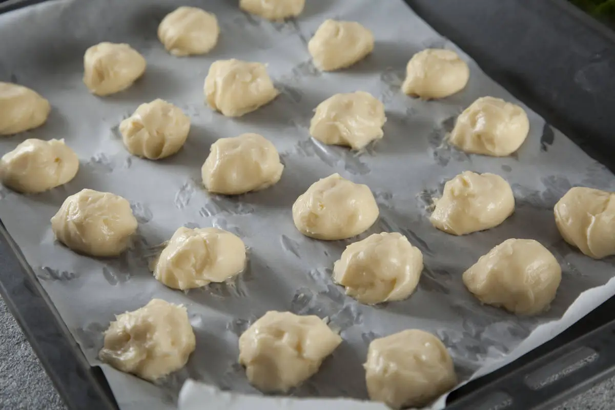Готовое тесто должно получиться гладким и достаточно густым, чтобы держать форму. Разогрейте духовку до 220 градусов. Противень выстелите бумагой для выпечки и выкладывайте тесто чайной ложкой, оставляя расстояние, чтобы поднявшиеся профитроли не слиплись между собой, мокрым пальцем пригладьте поверхность тестяных шариков. Ставьте противень в горячую духовку, выпекайте при 220 градусах 10 минут, затем убавьте температуру до 190 градусов и пеките до насыщенного золотистого цвета, затем выключите духовку и оставьте остывать с приоткрытой дверцей.