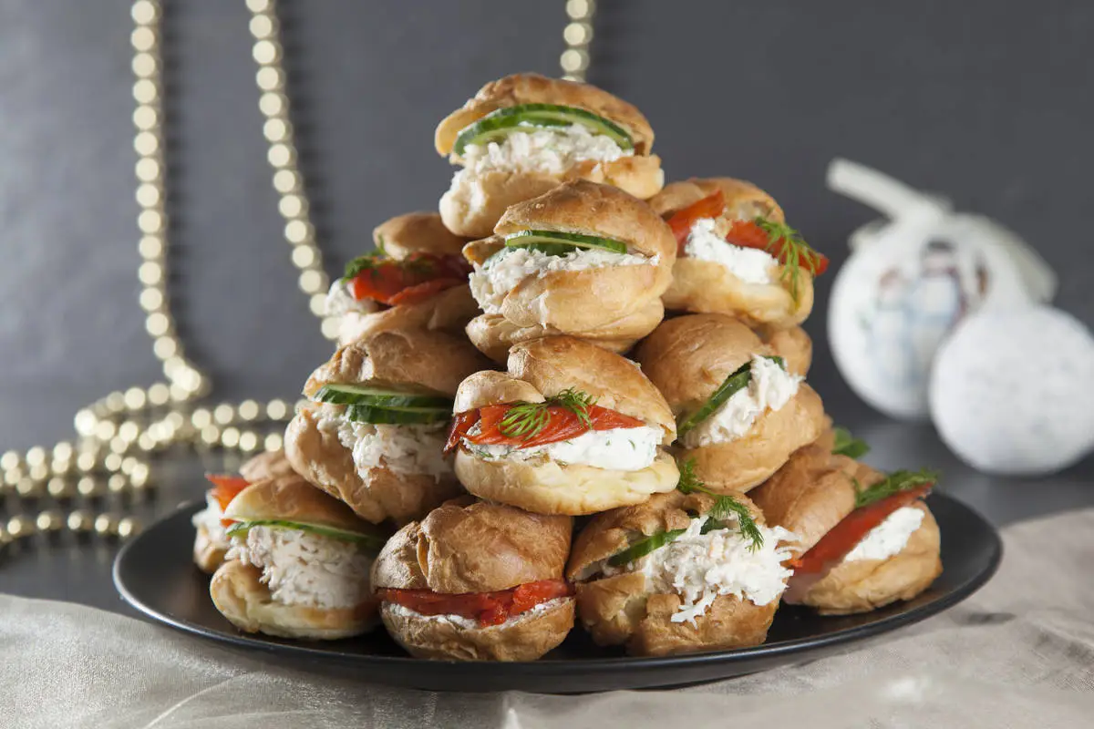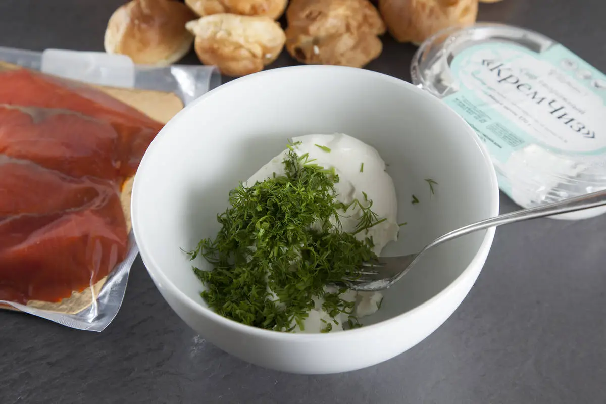 Для начинки с рыбой сыр творожный «кремчиз» смешайте с рубленым укропом, рыбу порежьте тонкими ломтиками. Профитроли разрежьте пополам, внутрь положите около чайной ложки кремчиза, а сверху ломтик рыбы, накройте верхней половинкой.