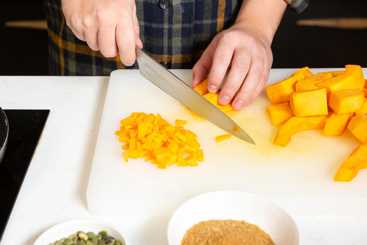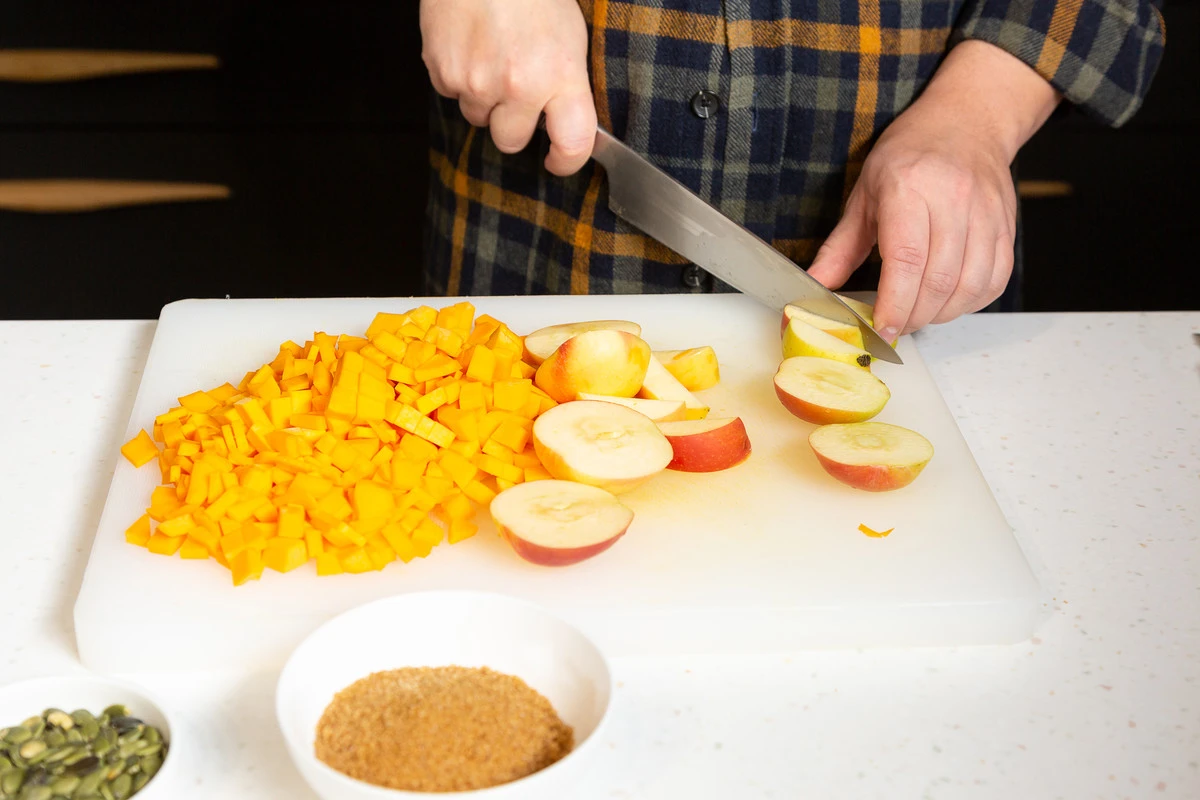 У яблок удалите сердцевину и также нарежьте их кубиками размером примерно 1х1 см.