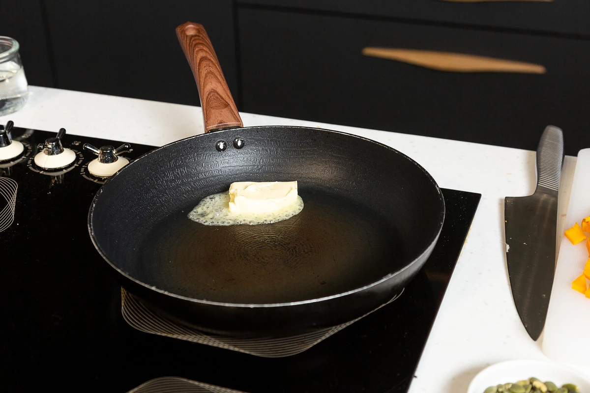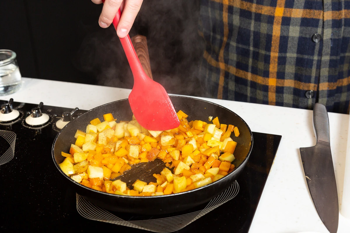 Растопите на сковороде сливочное масло. Выложите в неё тыкву, яблоки, добавьте сахар и пряности, перемешайте.