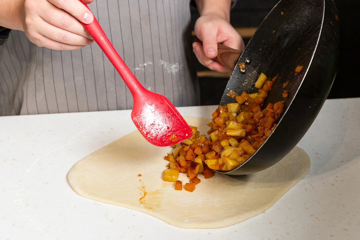 Присыпьте рабочую поверхность небольшим количеством муки и раскатайте тесто в квадрат толщиной примерно 5 мм. Выложите на середину пласта начинку.