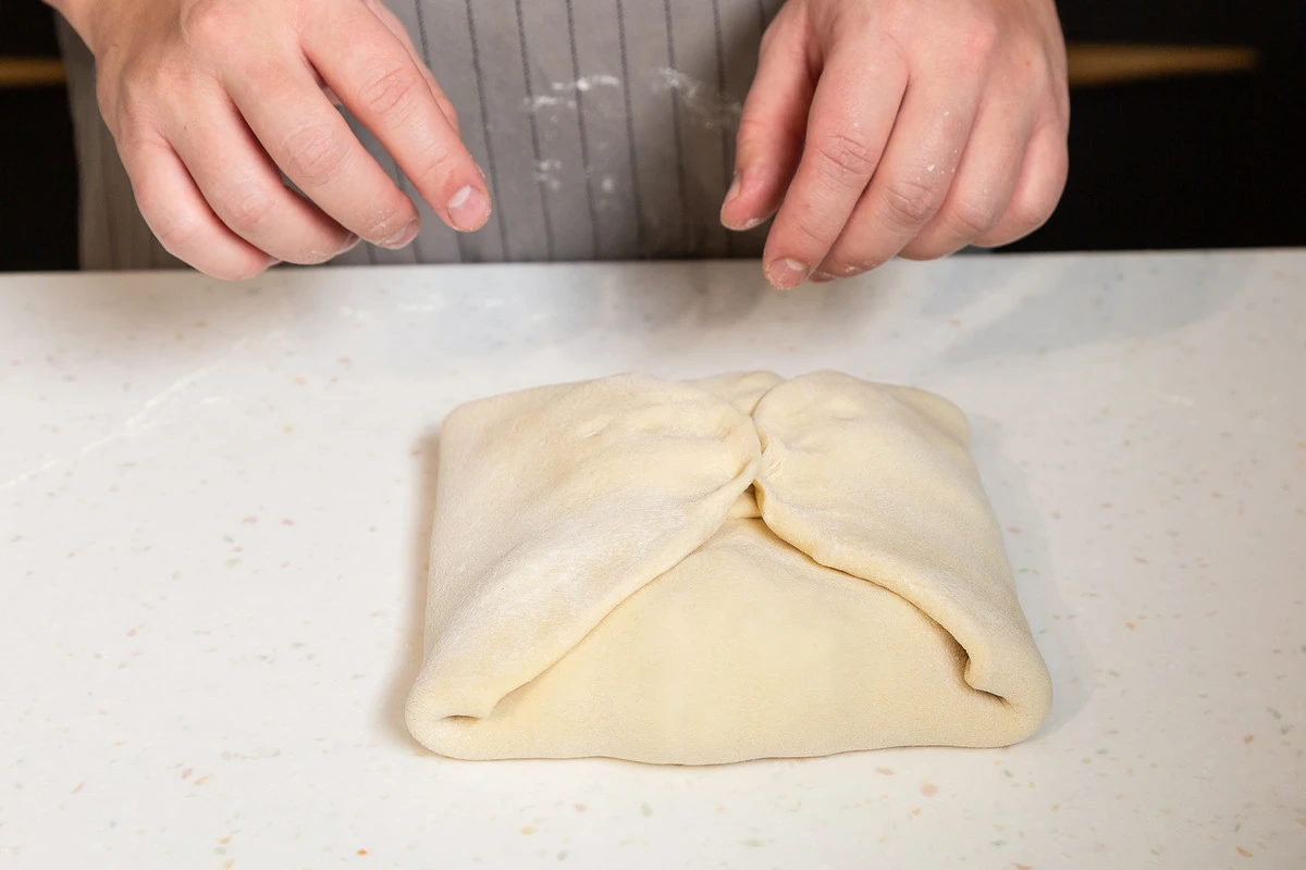 Заверните тесто с 4 сторон, чтобы получился конвертик, и тщательно залепите швы.