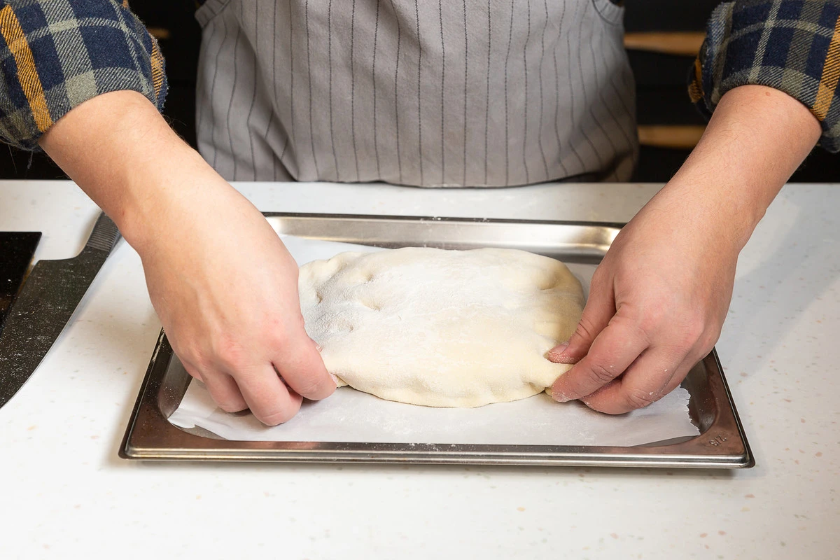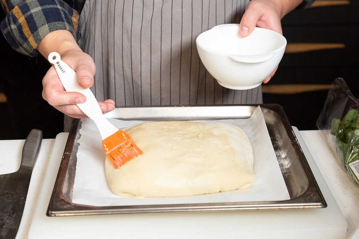 Застелите противень пергаментом для выпечки и аккуратно переложите пирог швами вниз. Оставьте пирог расстаиваться на 30 минут при комнатной температуре, накрыв пищевой плёнкой.