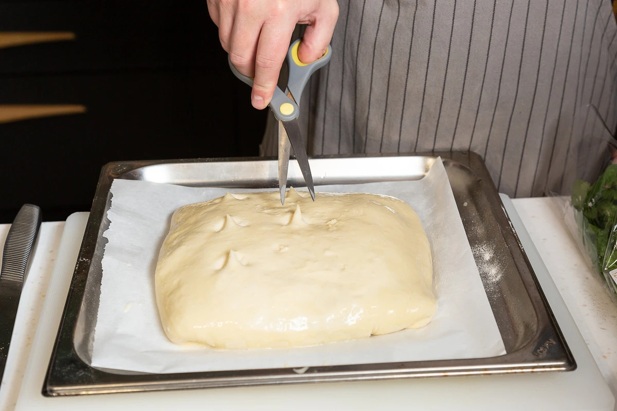 Сделайте надрезы на верхней части пирога и запекайте его в разогретой до 190 °C духовке предпочтительнее на режиме «Конвекция» в течение 18-20 минут до румяной корочки.