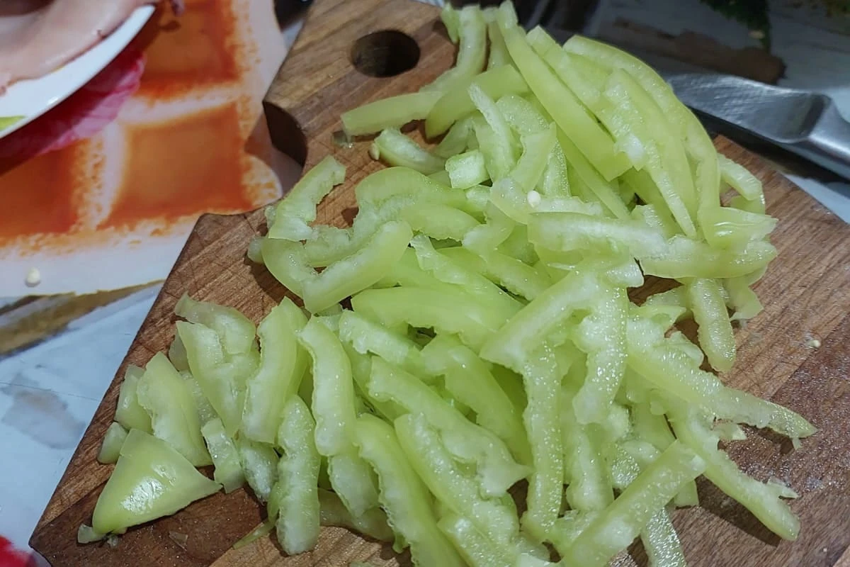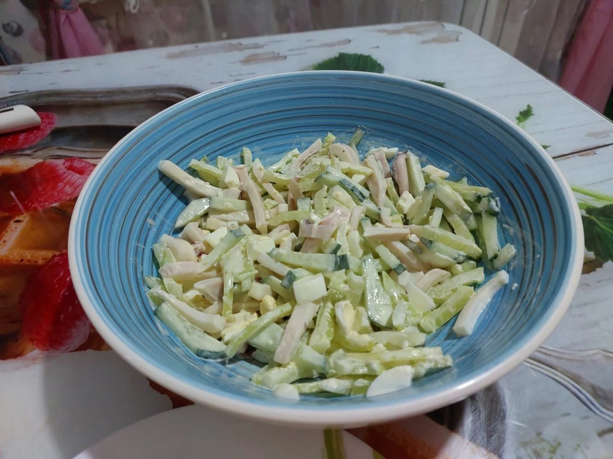 Кальмаров отварите 1 минуту (до побеления). Очистите и нарежьте соломкой.