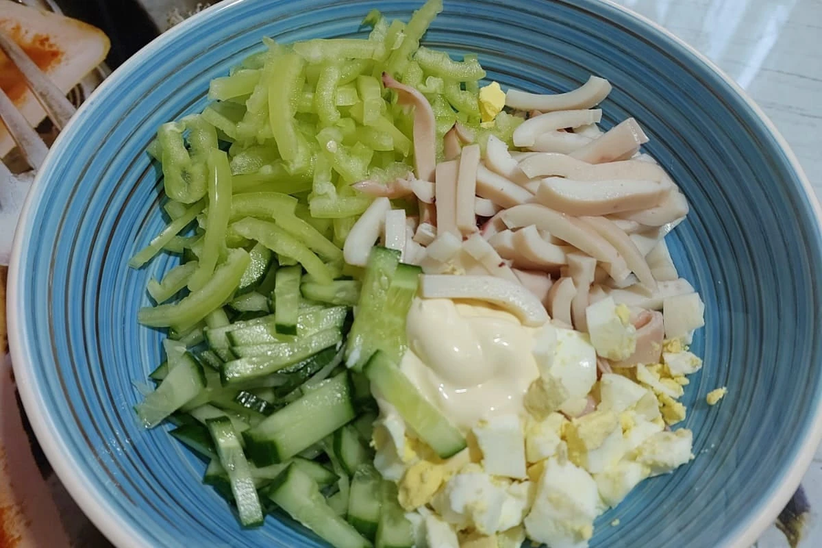Вкусный и полезный салат из кальмаров готов. Можно также добавить в него консервированную кукурузу.