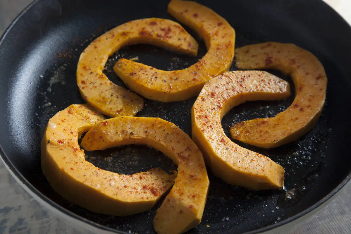 В сковороде растопите сливочное масло и обжарьте тыкву до румяной корочки, затем накройте крышкой и потомите на небольшом огне до мягкости.