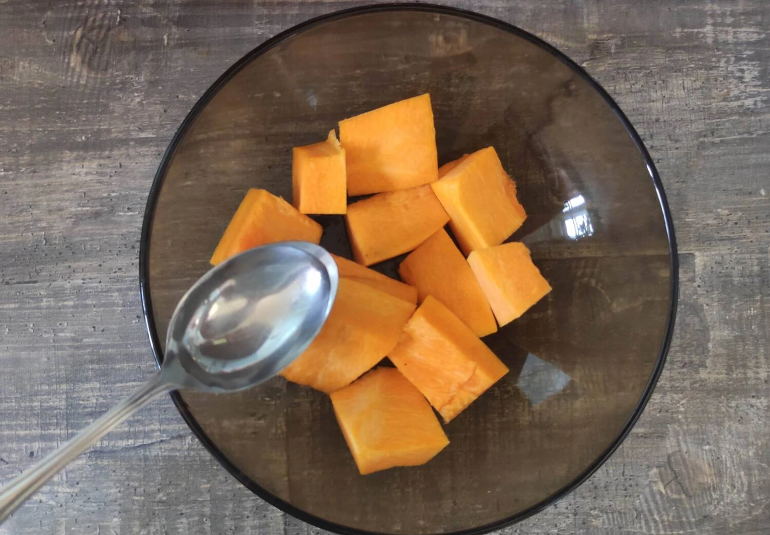 Поместите 200 г нарезанной кубиками тыквы в миску с 1 ст. л. воды, накройте тарелкой или пищевой плёнкой и поставьте в микроволновку на 5-10 минут (до мягкости тыквы). Тщательно разомните вилкой и остудите.