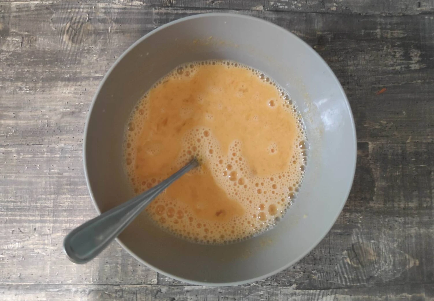 В глубокой миске смешайте 150 мл молока, 1 яйцо, тыквенное пюре, 3 ст. л. обычного белого сахара и 1 ч. л. ванильного сахара. Взбейте всё вилкой до объединения ингредиентов.