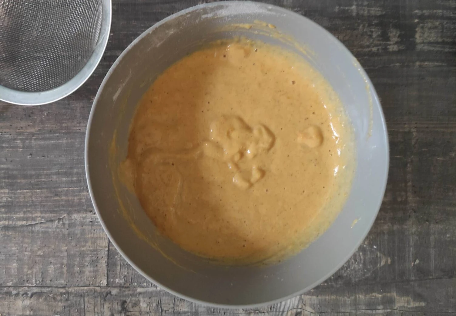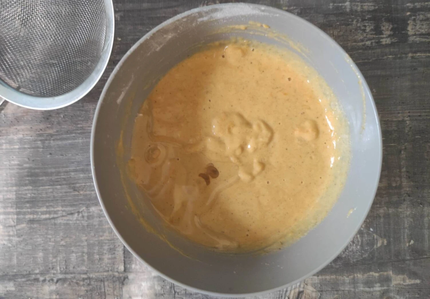 Отдельно смешайте все сухие ингредиенты: 130 г муки, разрыхлитель, соль и все специи. Просейте получившуюся сухую смесь в миску к жидким ингредиентам и размешайте до однородности (без комочков).