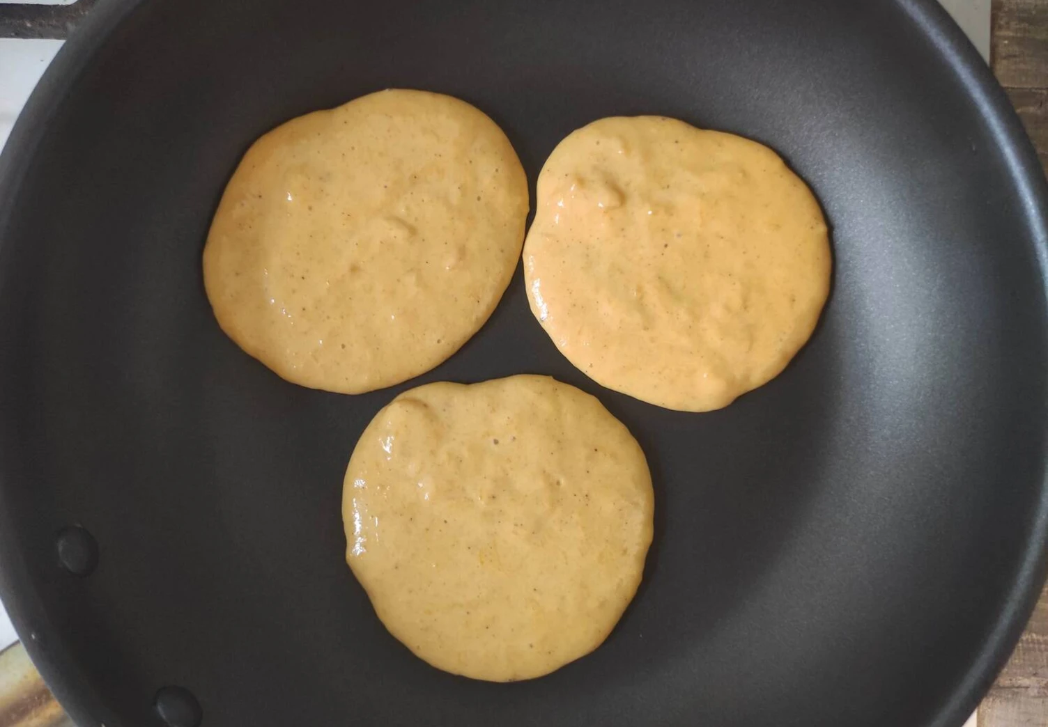 Разогрейте сковороду на среднем огне без масла и большой ложкой выкладывайте панкейки. Переворачивайте, когда на поверхности блинчиков появятся пузырьки (около 2-3 мин с каждой стороны). Готовьте под крышкой.