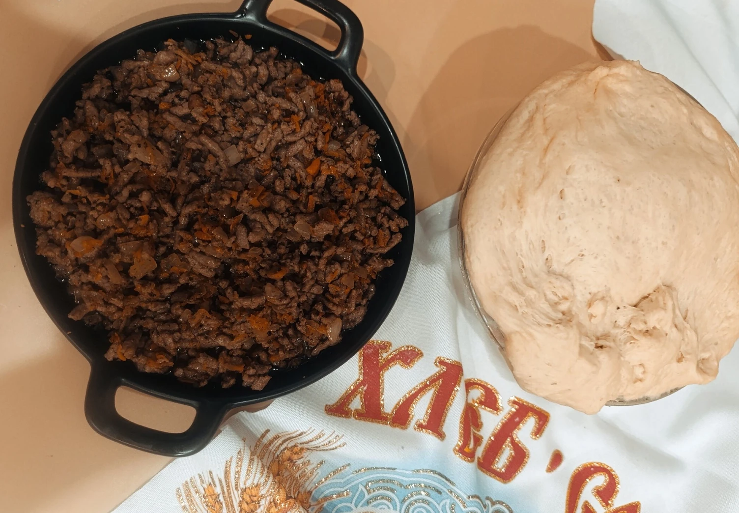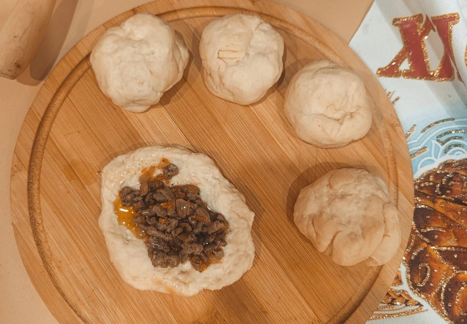 Присыпьте стол мукой. Сделайте из каждого шарика теста лепёшку. В середину положите мясную начинку и слепите пирожок.