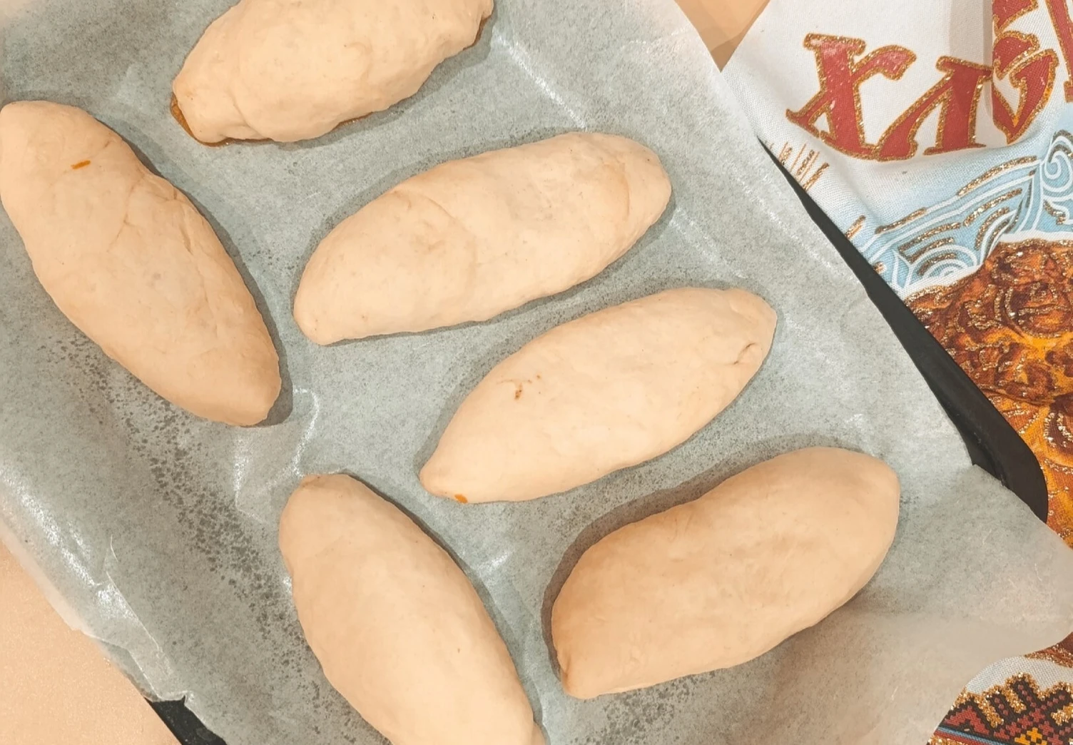 Застелите противень пергаментной бумагой. Выложите пирожки на бумагу швом вниз, на небольшом расстоянии друг от друга. Накройте пирожки и оставьте на расстойку на 15 минут.