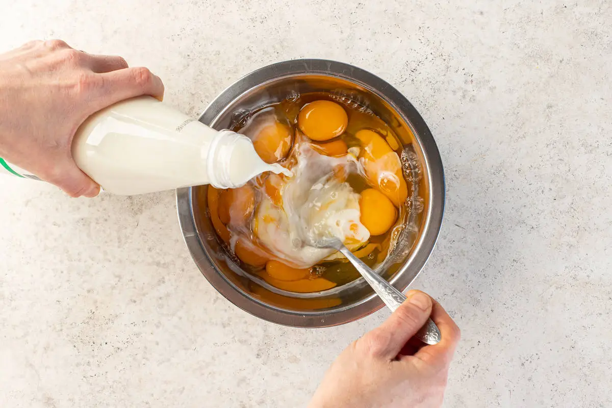 Яйца размешайте вилкой с молоком и солью. Важный нюанс: не нужно взбивать в пену, просто размешайте.