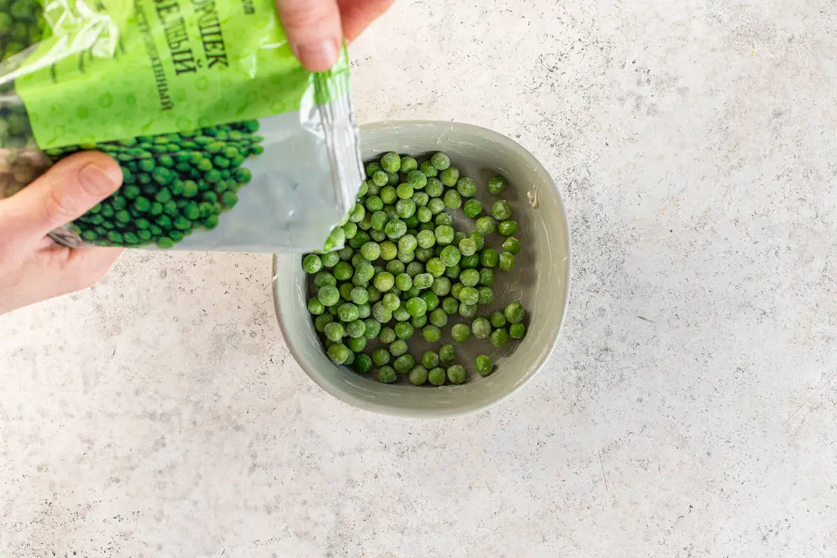 Форму для запекания (подойдёт любая небольшая, но высокая) смажьте маслом. На дно насыпьте горошек.