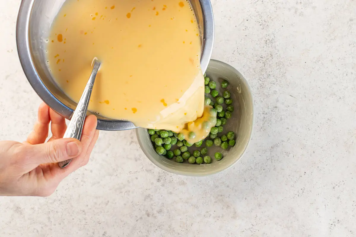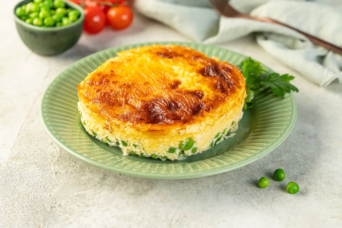 Пышный и высокий омлет делается просто и быстро в духовке. Нежный зелёный горошек очень хорошо подходит к омлету, но можно использовать также и другие овощи либо кусочки сыра или ветчины.