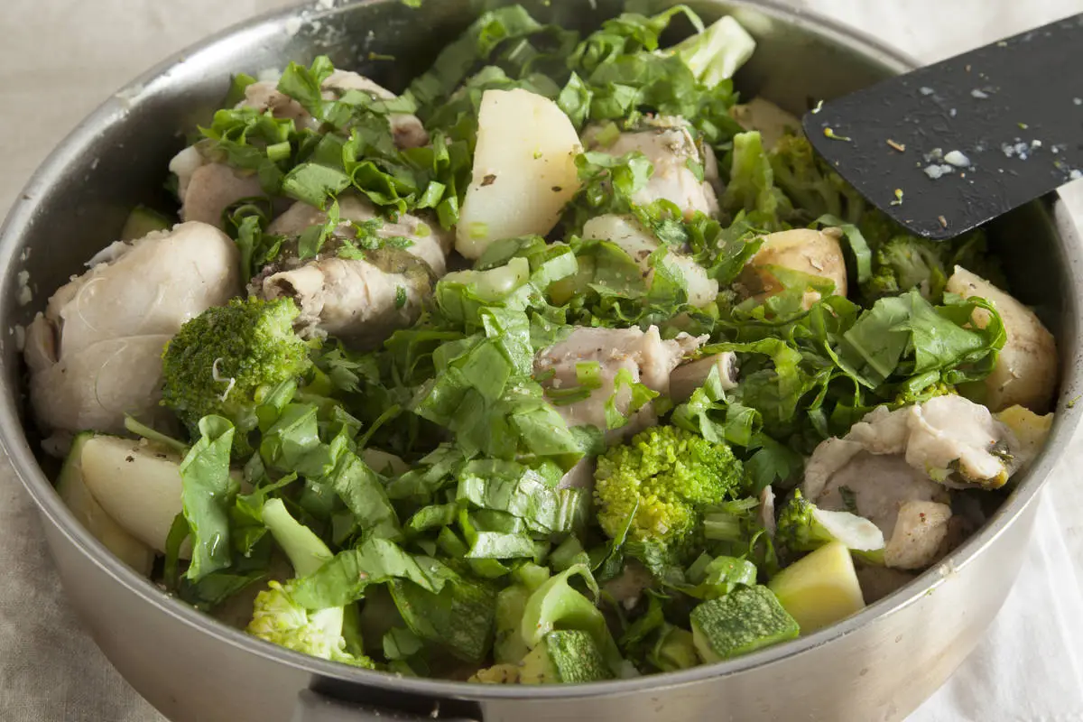 Добавьте овощи к курице и картофелю, перемешайте и готовьте еще 5-10 минут. Приятного аппетита!