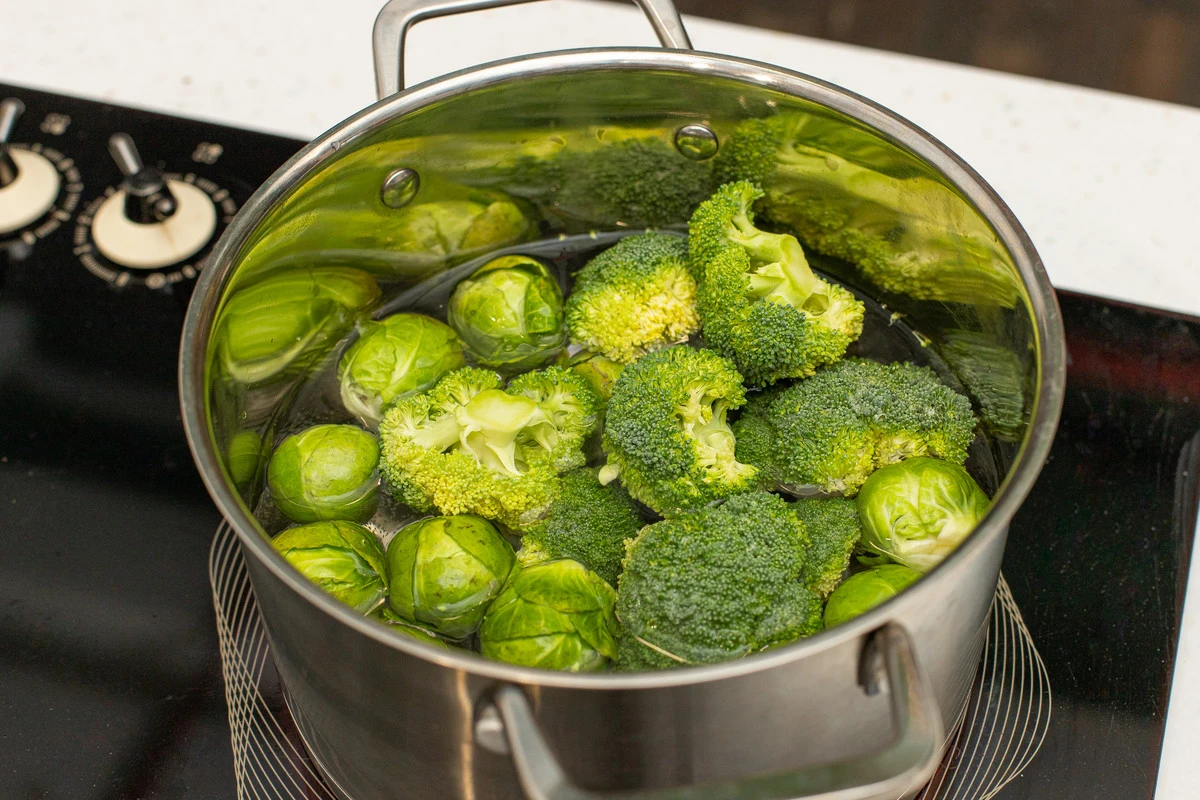 Брюссельскую капусту бланшируйте в кипящей воде в течение 5 минут, затем добавьте брокколи и бланшируйте ещё 2 минуты.