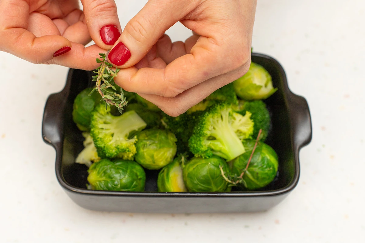 Откиньте на сито и облейте капусту холодной (лучше даже ледяной) водой, чтобы она не потеряла цвет и хруст. Выложите капусту в форму, смазанную сливочным маслом, добавьте листики тимьяна.