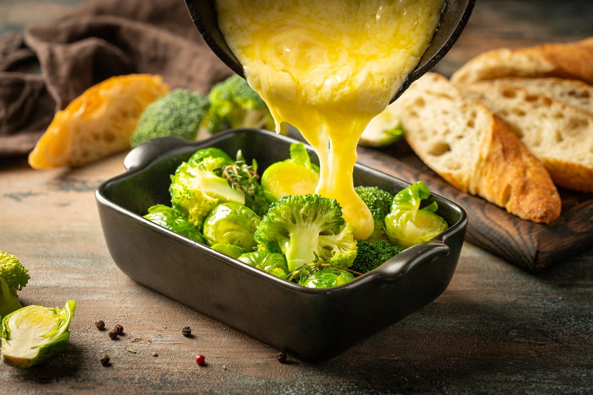 Залейте растопленным сыром капусту и сразу подавайте к столу с ломтиками багета.
