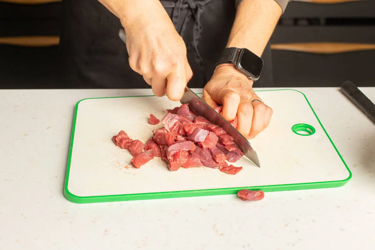 Лук и морковь очистите. Лук нарежьте кубиками, морковь измельчите на терке. Мясо нарежьте крупными кубиками.