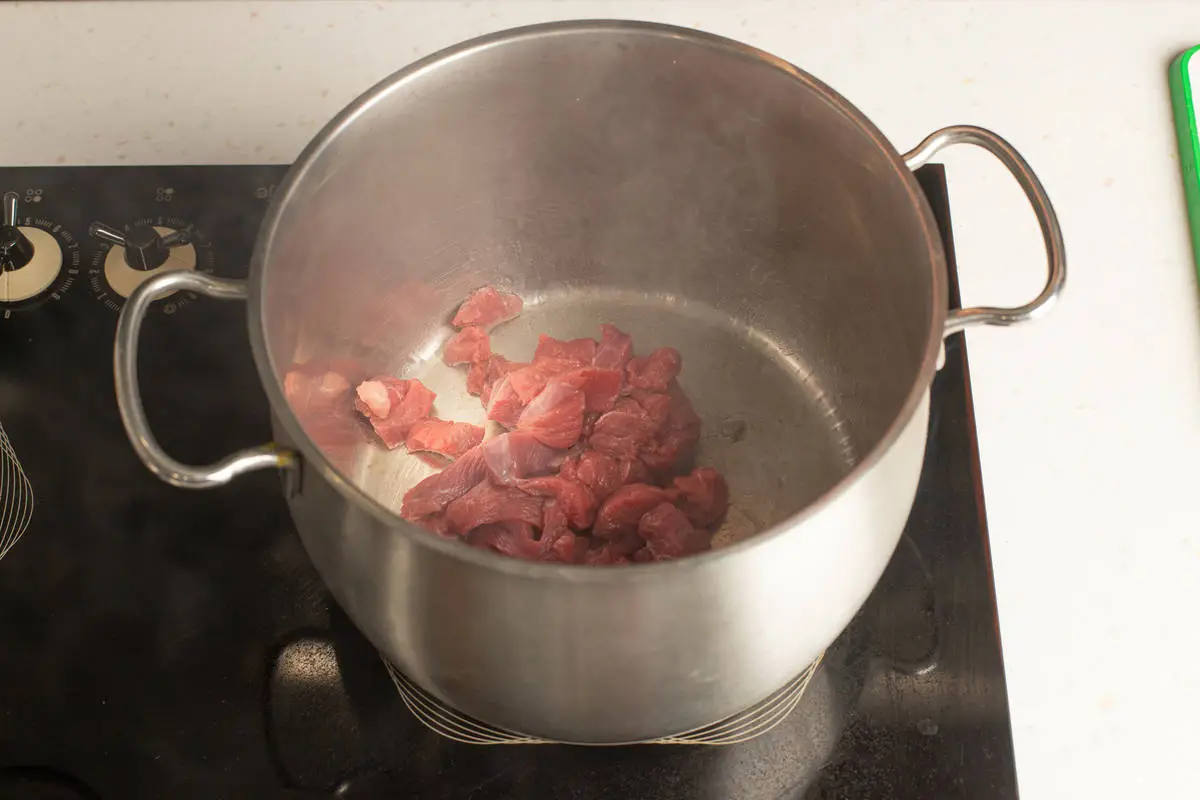 Обжарьте в кастрюле мясо, морковь и лук на растительном масле на среднем огне.