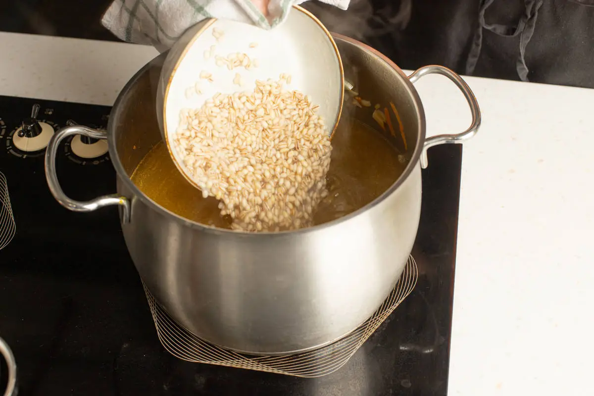 Добавьте в кастрюлю перловку, залейте 3 литрами воды. Доведите до кипения, убавьте огонь и варите около 20 минут.