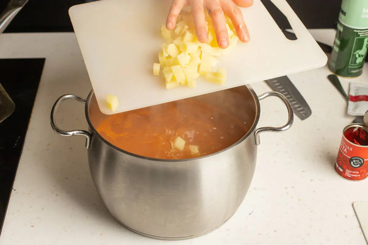 Картофель очистите и нарежьте мелкими кубиками. Добавьте в суп и варите до готовности картофеля (около 15-20 минут).