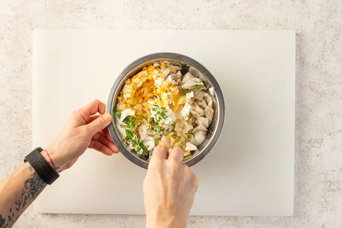 Яйца нарежьте кубиками, рыбу разомните вилкой. Смешайте с рисом, жареным луком и измельчённым зелёным луком, солью, кориандром и сметаной, перемешайте.