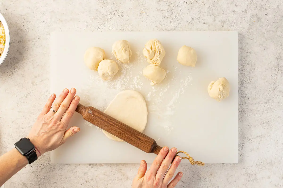 Тесто разделите на 8 кусочков, раскатайте каждый скалкой.