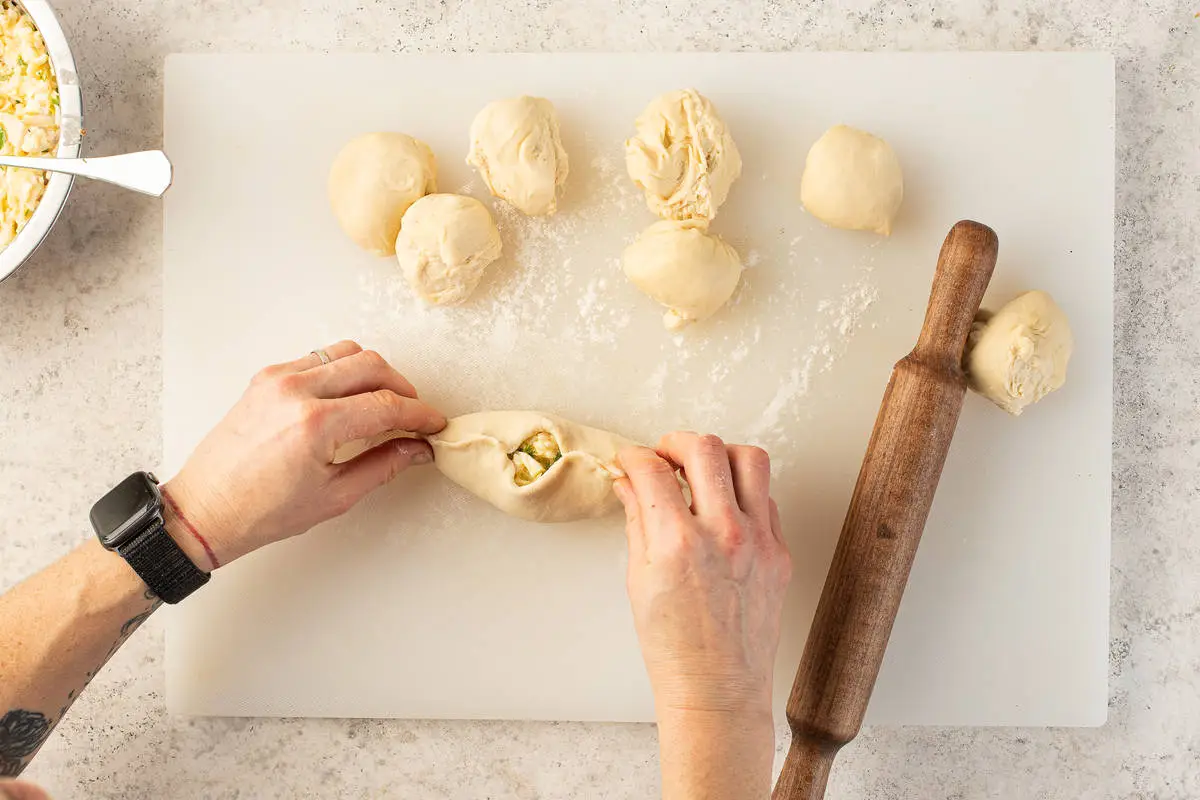 Кладите в центр начинку и защипывайте пирожки в форме лодочки, оставляя в центре отверстие.