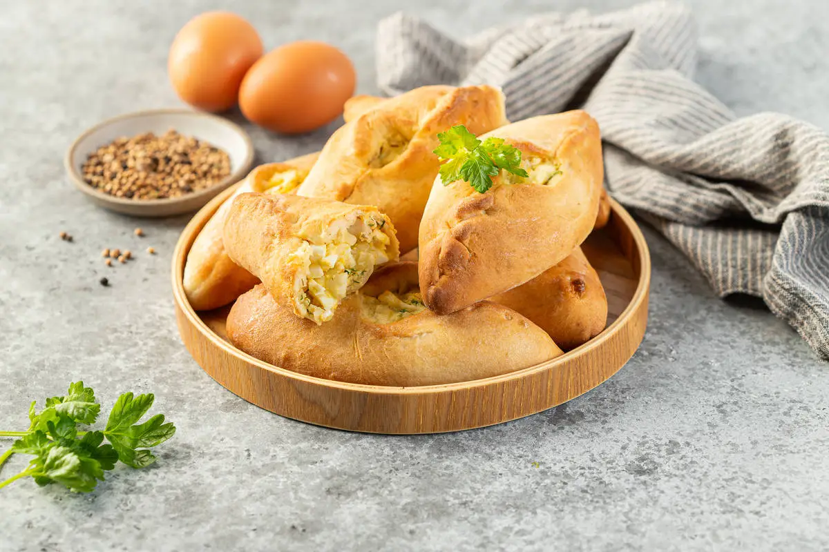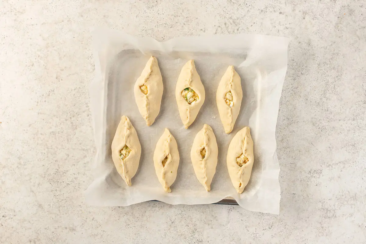 Выложите расстегаи на противень, застеленный пергаментом для выпечки.