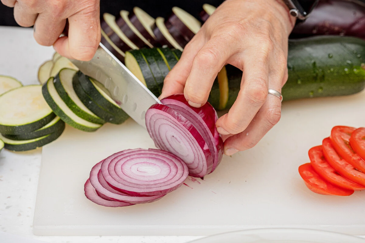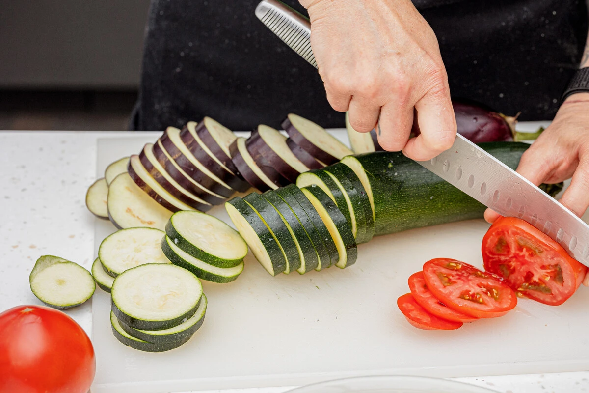 Баклажаны, кабачки и помидоры нарежьте кружочками толщиной примерно 0,5 см.