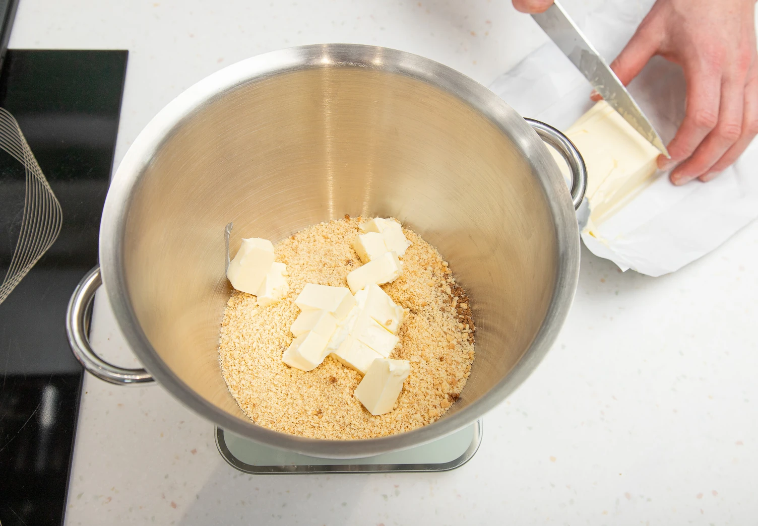 Смешайте полученную крошку со сливочным маслом комнатной температуры.
