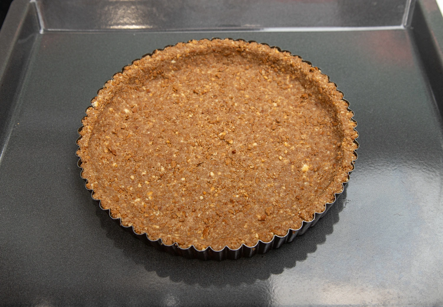 Выложите массу в форму для тарта с бортиками и как следует утрамбуйте. Выпекайте 6 минут в духовке, разогретой до 180 градусов.