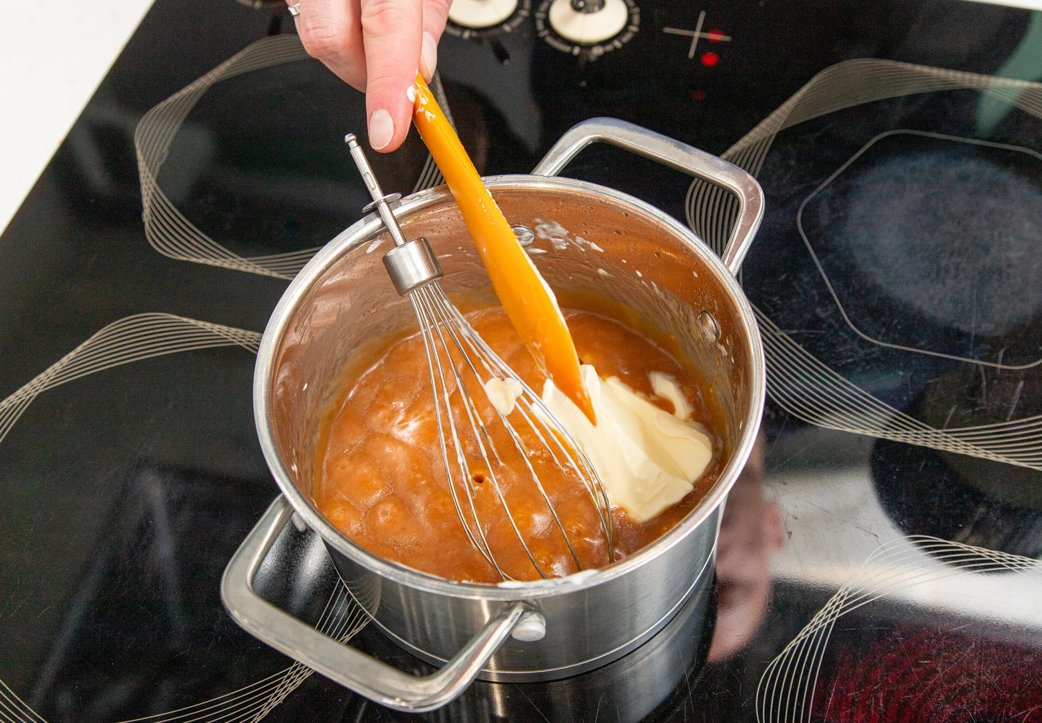 Добавьте в карамель сливочное масло и перемешайте до однородности. По желанию можно пробить массу погружным блендером. В конце добавьте заранее размоченный желатин и уберите карамель в холодильник до полного охлаждения.