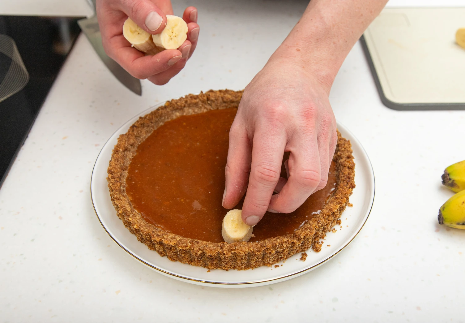 Соберите тарт: основу из печенья смажьте примерно половиной порции карамели, сверху выложите кружочки бананов и полейте оставшейся карамелью.