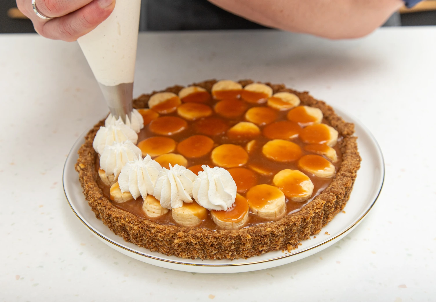 Классика британской кухни, которая покорила мир! Всё гениальное просто: хрустящая основа, сладкая карамель, сырный крем и свежий банан. А если взять готовую варёную сгущёнку, десерт соберётся буквально за минуты. Попробуйте — и баноффи станет вашим любимым рецептом для уютных чаепитий и неожиданных гостей.