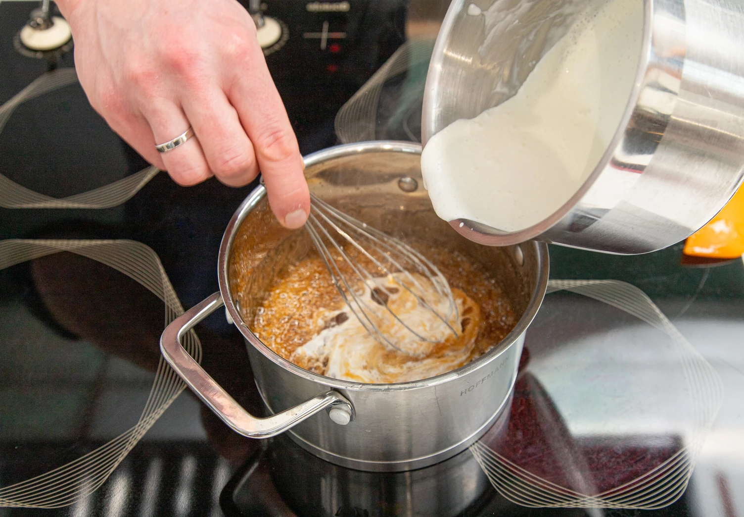150 мл сливок нагрейте почти до кипения и аккуратно, медленными движениями подмешайте к карамели.