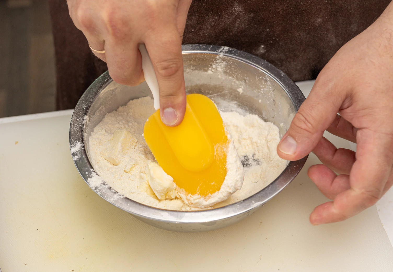 Нарежьте холодное сливочное масло на кубики и перетрите вместе с мукой и солью в крошку.