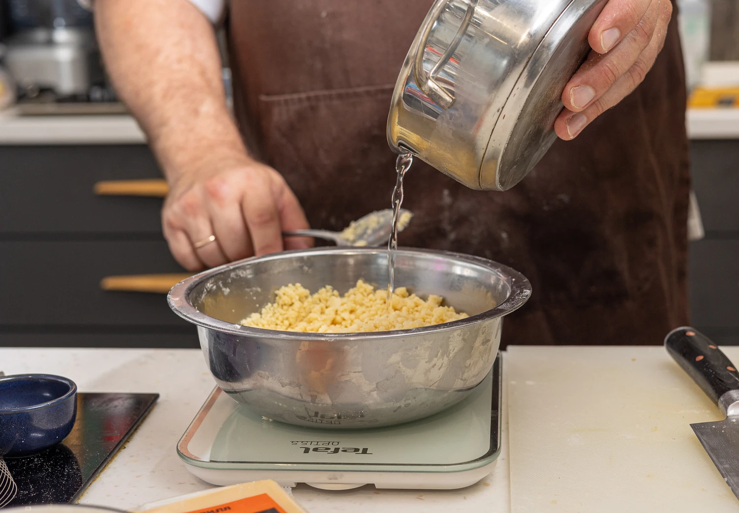 Влейте в эту крошку сначала 30 мл холодной воды и попробуйте собрать тесто в шар. Если не получается, добавьте ещё воды. Готовое тесто заверните в плёнку и уберите в холодильник на полчаса.