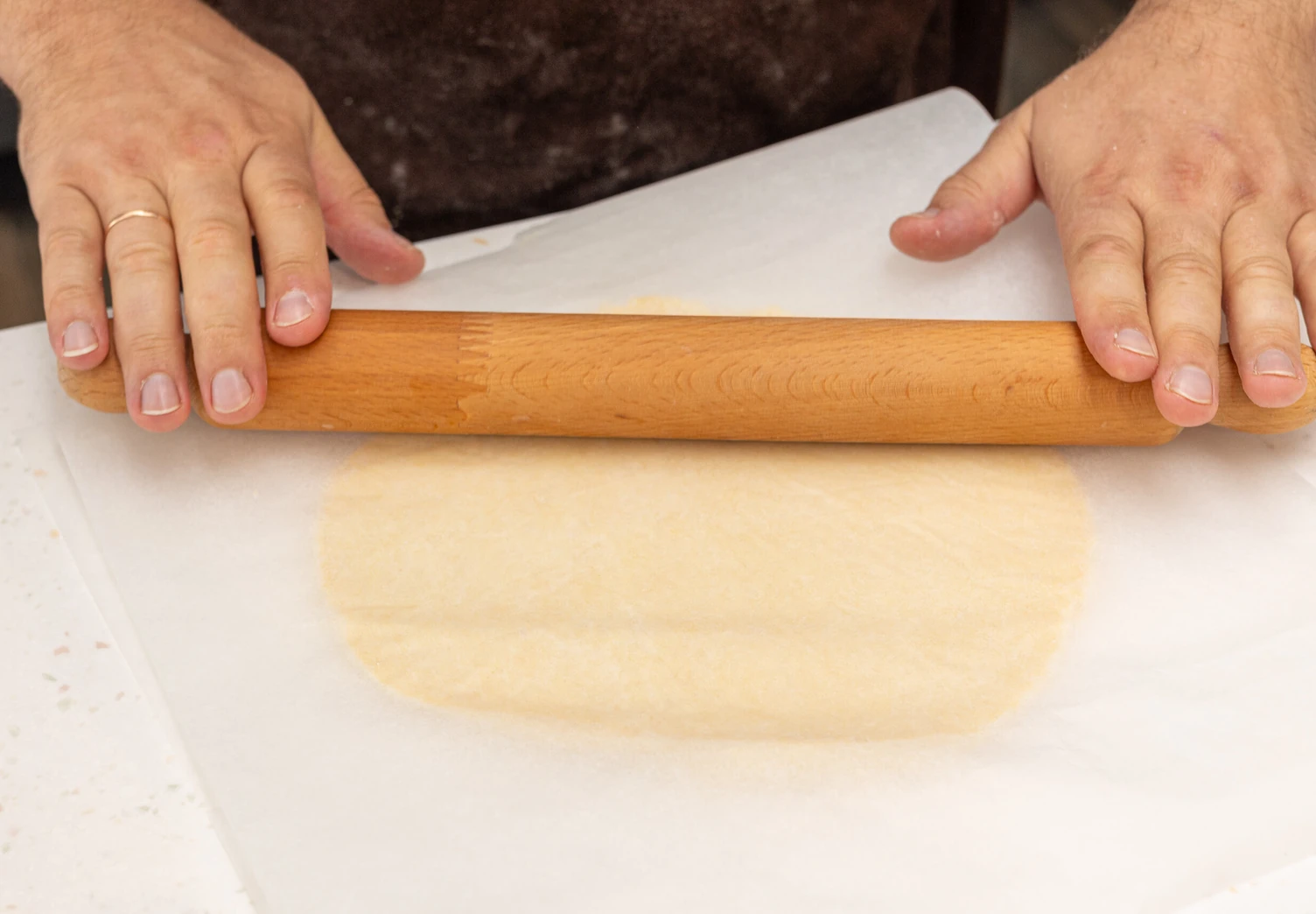 Раскатайте охлаждённое тесто между двумя слоями пергамента в пласт толщиной около 3–4 мм, придавая ему форму круга. Выложите получившийся корж в форму для выпечки и обрежьте края. Уберите эту заготовку в морозилку.