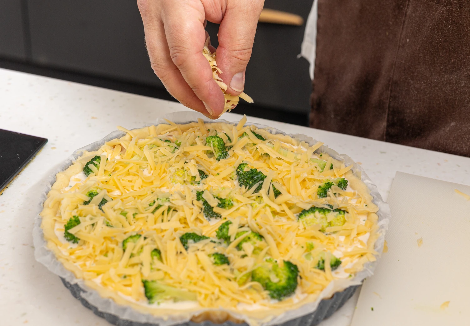 Выложите в форму с тестом курицу и брокколи, залейте молочной смесью и посыпьте сыром.