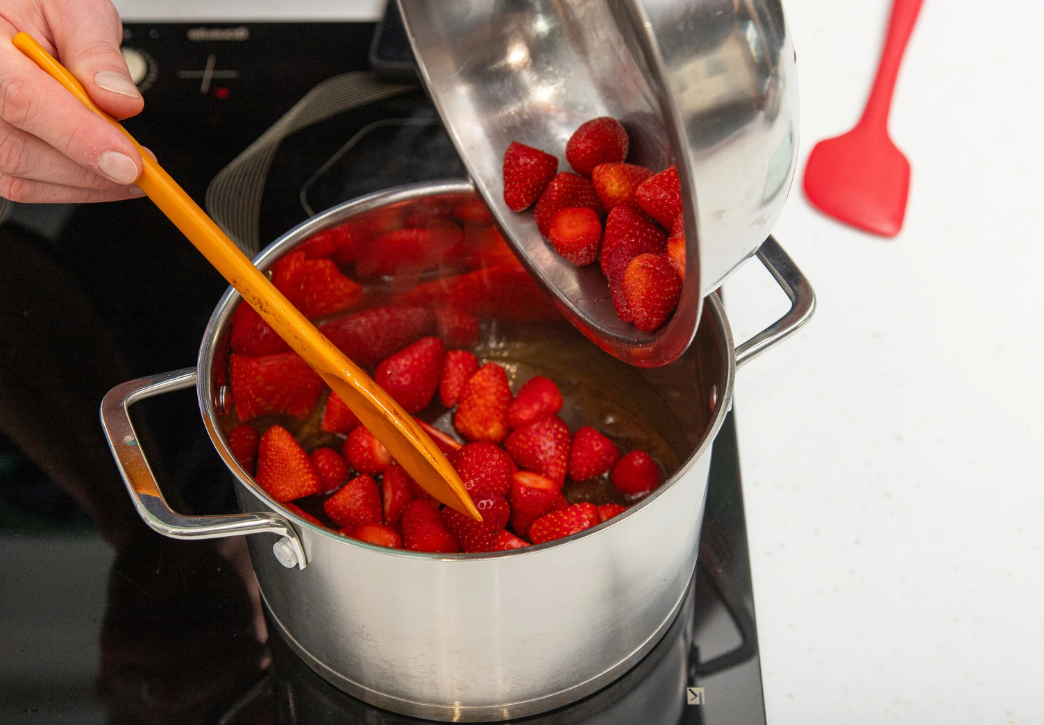 Снимите с огня, добавьте сливочное масло, заранее замоченный желатин и ягоды клубники, разрезанные пополам. Остудите до комнатной температуры.