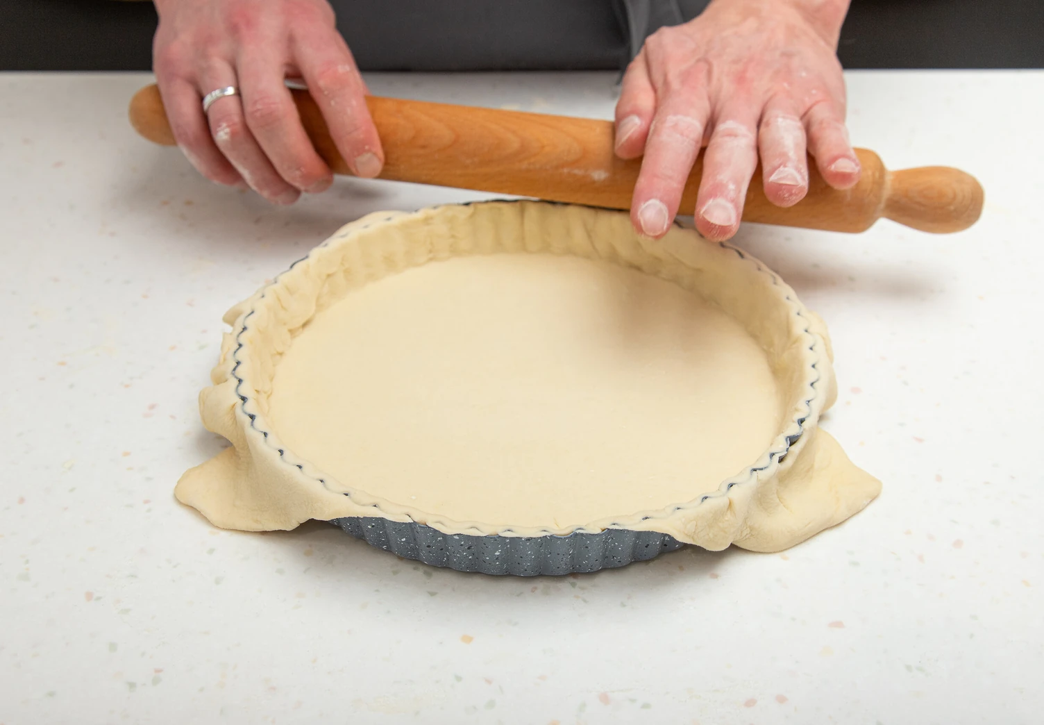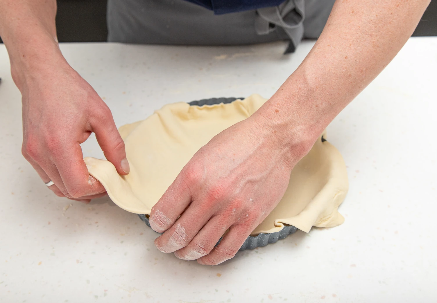 Выложите корж в форму для тарта, застелите пергаментом или фольгой и насыпьте какой-то груз: фасоль, бобы, гречку или пекарские камни. Выпекайте в духовке, разогретой до 200 градусов, 35 минут под грузом и ещё 5–6 без него.