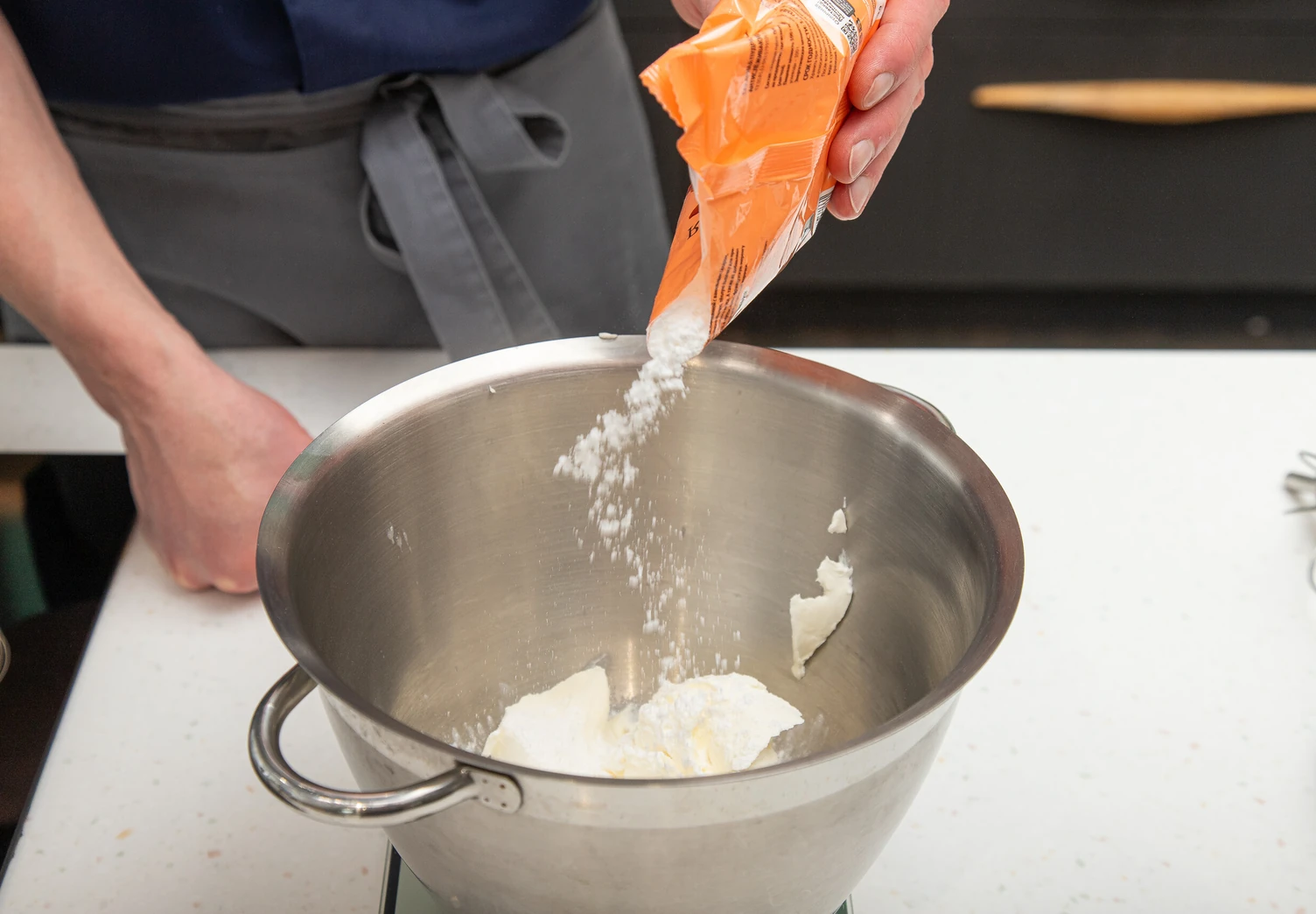 Пока печётся основа, приготовьте крем. Для этого выскребите семена из половины стручка ванили. Смешайте в миске крем-чиз, маскарпоне, ваниль, пудру и сливки.