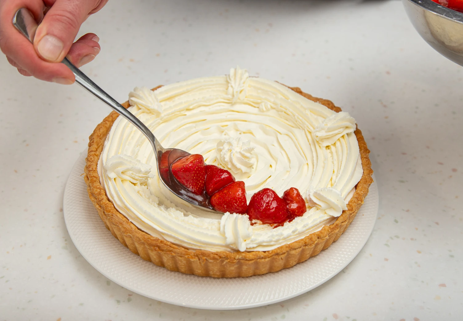 На остывшее тесто выложите сырный крем, сверху — ещё тёплую клубнику в соусе. Уберите хотя бы на полчаса в холодильник перед подачей.