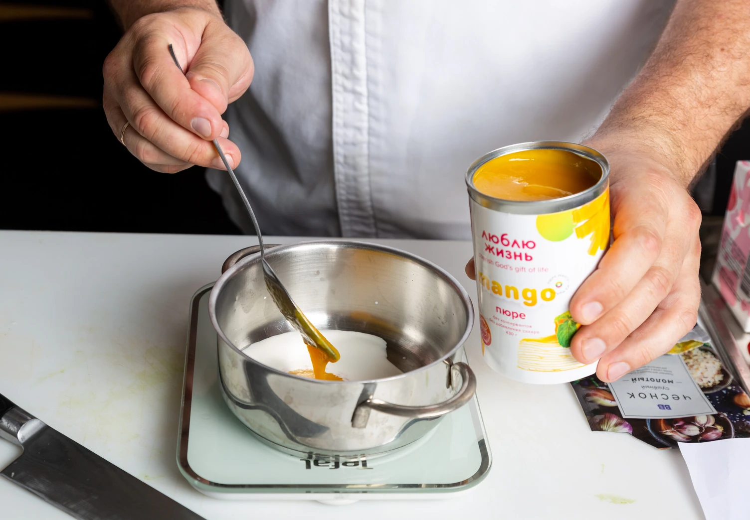 Для мангового соуса смешайте в сотейнике сливки и манговое пюре, доведите до кипения.